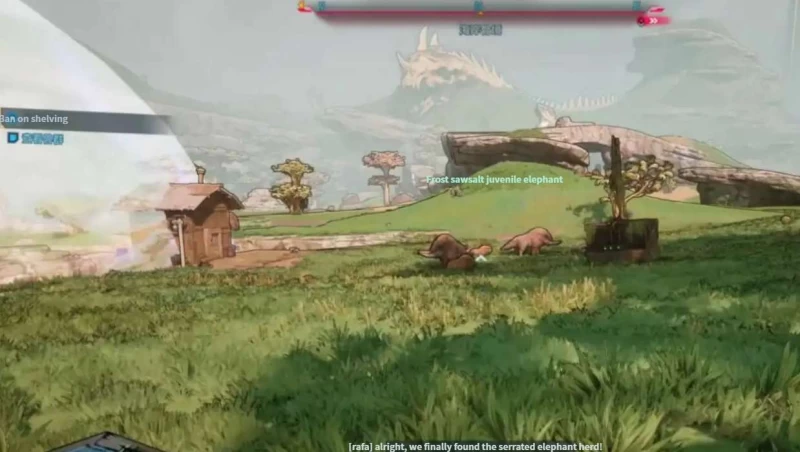 走个大概 1 分钟,就能看到远处有教团的飞船在低空飞,下面跟着一群锯齿象,这时候不用动手,盯着飞船就行。