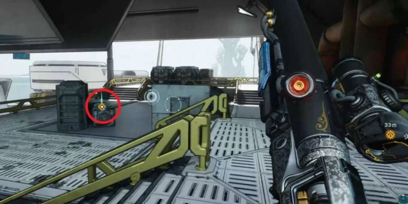 拿完第二个道具,扒开旁边的出风口往里走。在另一侧能找到一个容易漏掉的武器箱和秘藏符号,我当时差点忘了开符号旁边的门,还好记得任务要继续前进。开门出去后,走左侧后方的楼梯接着走。